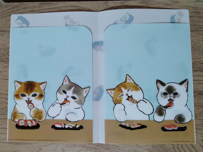 【セリア×mofusand】仕事を頑張る猫やお寿司がかわいい! 内側のイラストも魅力的な「A5見開きファイル」