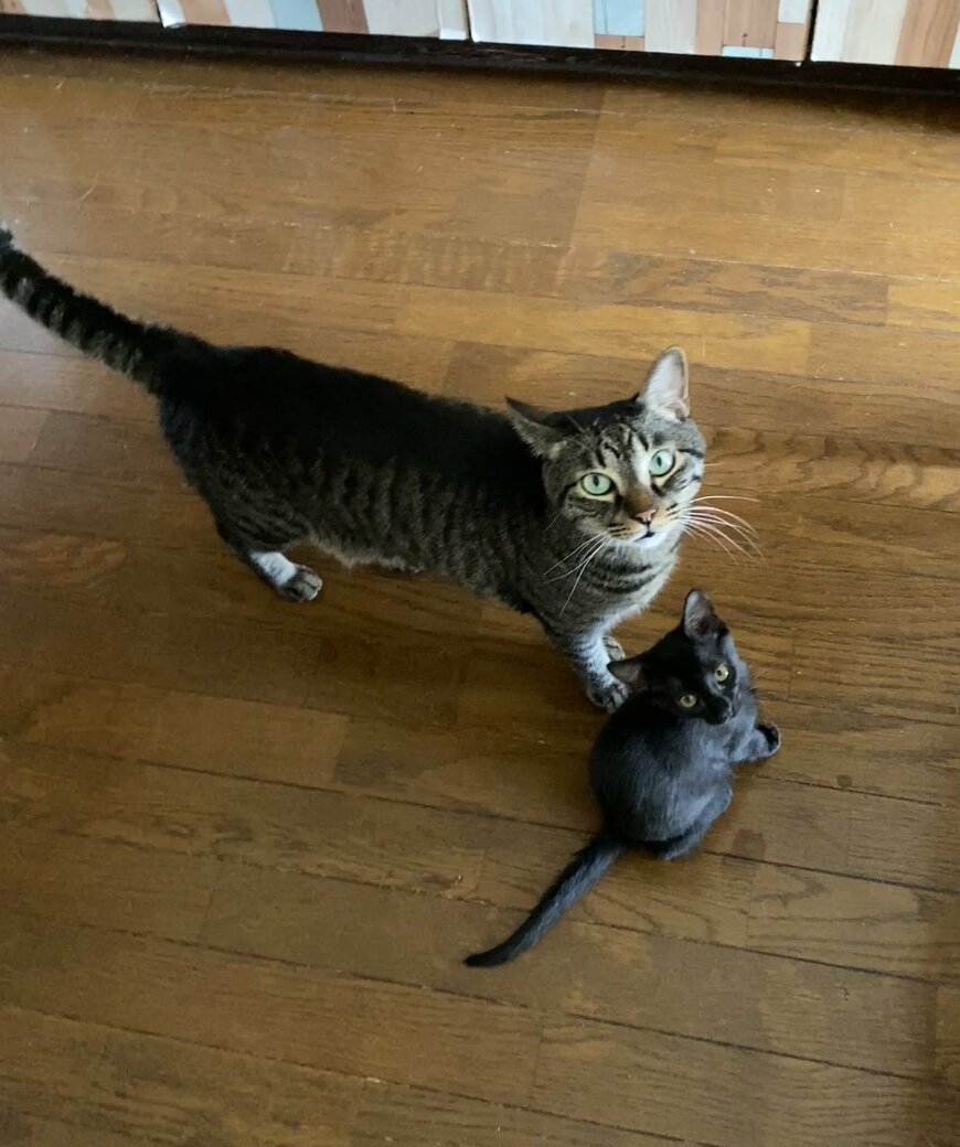 1枚目の写真に写っているのは、保護子猫の「コンブ」くんと先住のキジトラ猫「シイタケ」くん。飼い主さんに揃って視線を送る様子からは「おかえり!!」といった雰囲気がただよいます。