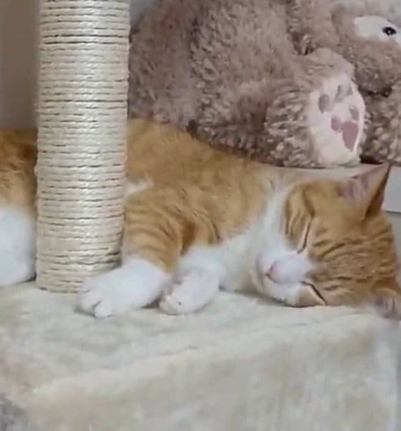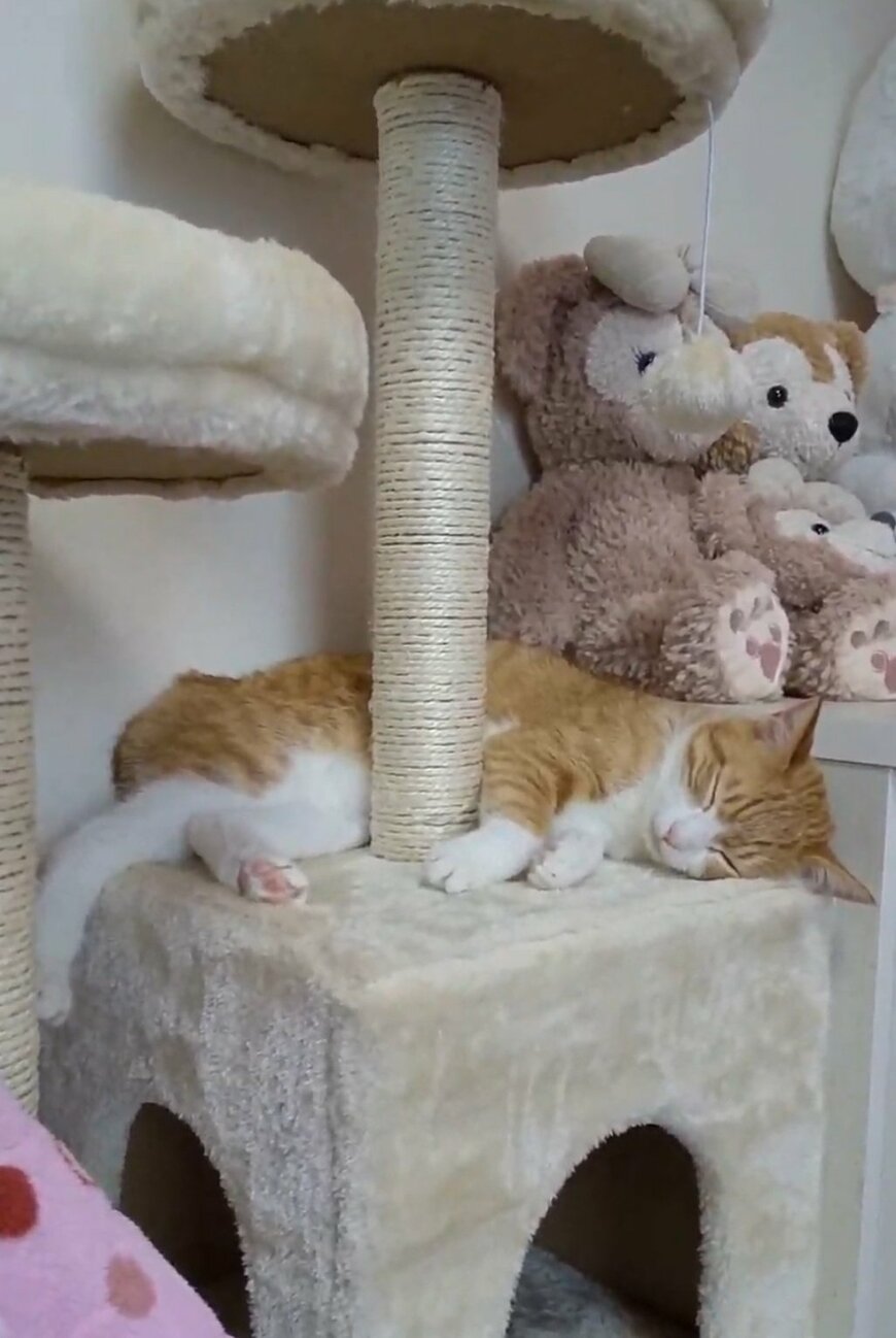 写真には、キャットタワーの柱をくるっと囲うような体勢で眠る、プリンちゃんの姿があります。だらんと伸ばした手足からは「完全にリラックスモード」といった具合がうかがえますね。
