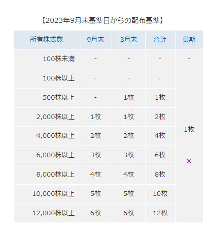 2023年4月の株式分割に伴い、500株で年間1枚付与。2000株で9月・3月に1枚ずつ、それ以上は保有株数に応じて付与数が増える仕組みで、最大は12000株以上で年間12枚です。