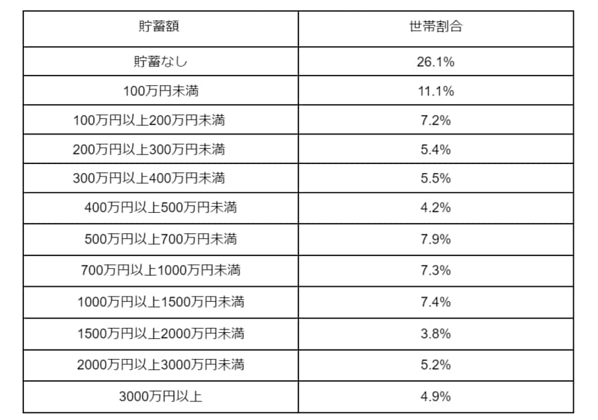 【図表1】によれば最も多いのが「貯蓄なし」で26.1%、2番目が「100万円未満」、3番目が「500万円以上700万円未満」という結果です。平均貯蓄額が825万円とはいえ、貯蓄が難しい世帯も多いことがわかります。