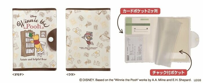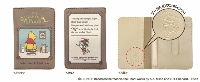 二つ折りのパスケースです。外側は本をイメージした大人っぽく上品なデザインになっており、内側には本を読みながら歩いているプーさんが型押しされています。内側のポケットにはカードを最大4枚収納できて便利です。