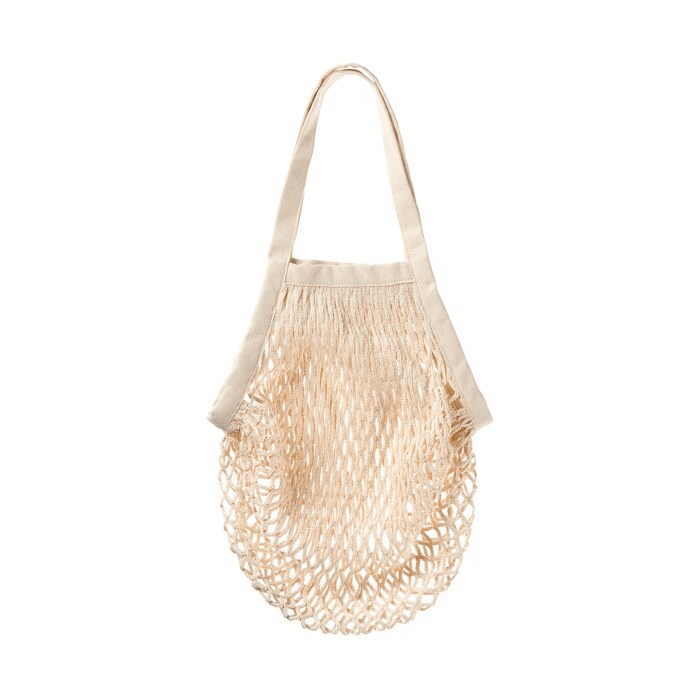 綿100%のナチュラルな風合いが魅力のメッシュのバッグです。太めのメッシュの編みヒモで、約幅37×長さ33cm、重量は約60g。
