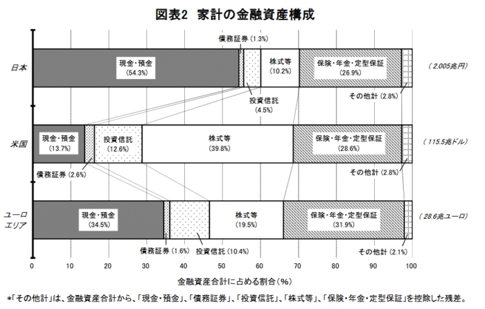 米国と比較すると元本保証のある預貯金好きなのが分かります。