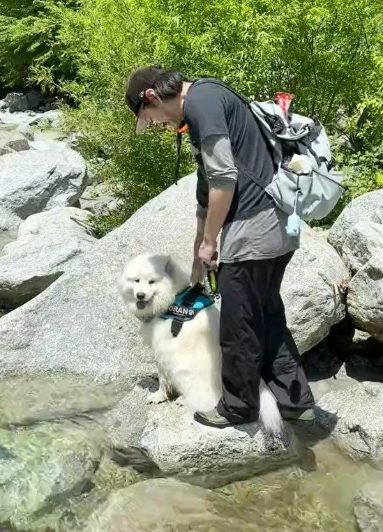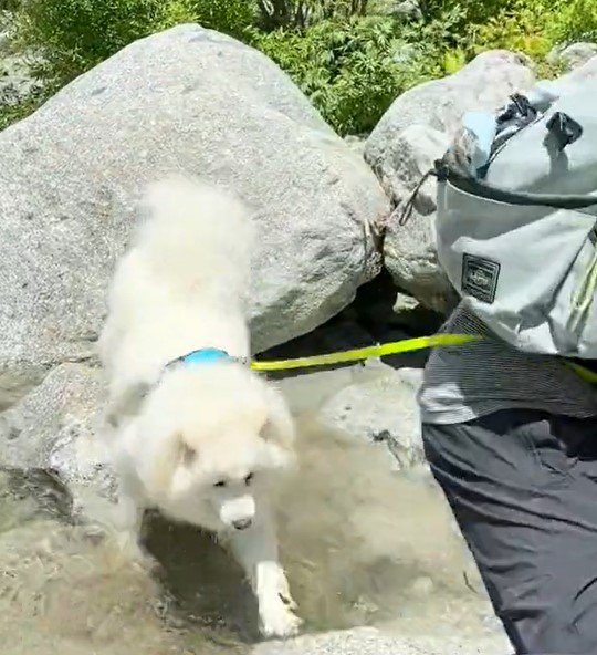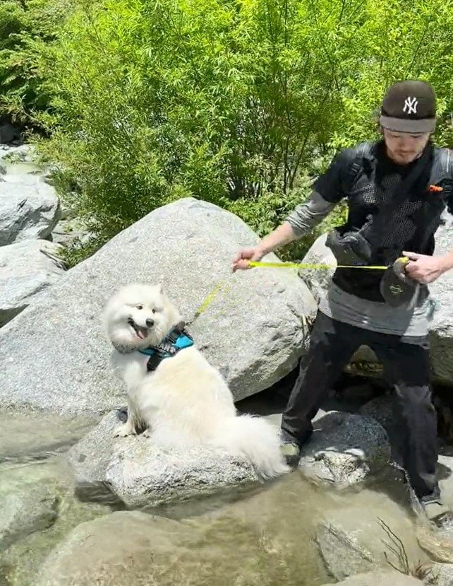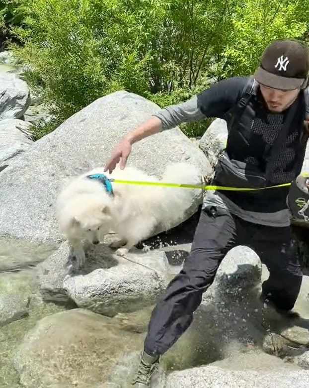 SNSで注目を浴びているのは、サモエドの「ソラン」くん。動画には川辺でお散歩を楽しむ、ソランくんとパパさんの姿がありました。