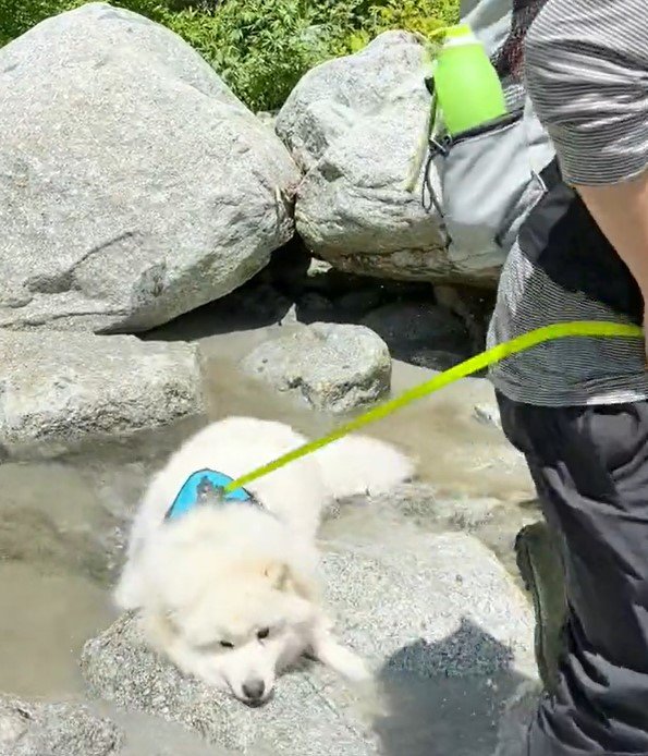 先ほどのパパさんと同じようにして、岩の上で「コテン」とつまづきました。パパさんはリードをキュッと引き、ソランくんもスクッと立ち上がります。そのシンクロ姿からは、なんだかパパさんとソランくんの仲の良さが伝わってくるようです……。