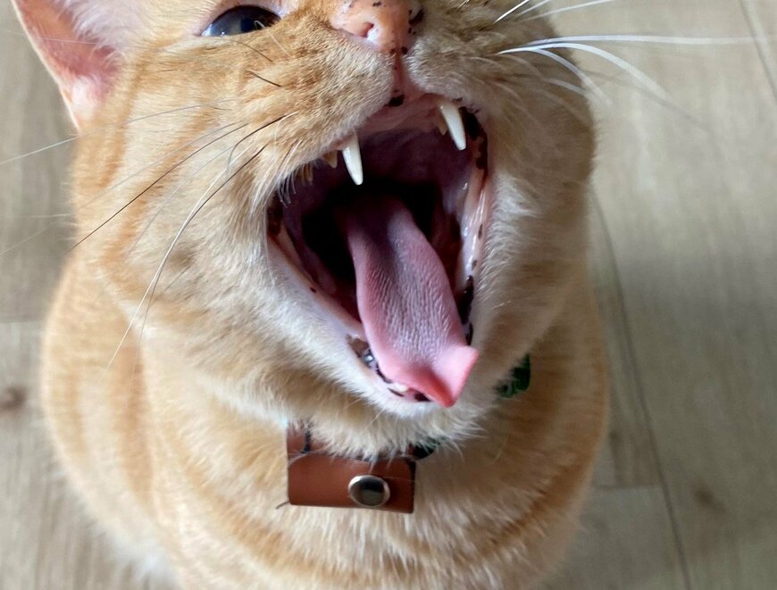 SNSで注目を浴びているのは、茶トラ猫の「モカ」くん。甘えん坊な性格をした元保護猫の男の子です。写真には、口を大きく開ききったモカくんの姿がありました。