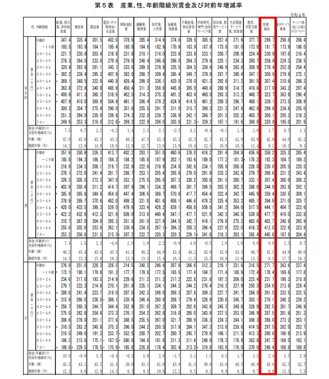 前年比は男女合計で1.7%増と全産業平均の1.4%増を上回っています。男性だけだと0.8%増、女性だけだと2.4%増で、賃金の伸びは男性が全産業平均(男性)以下、女性が全産業平均(女性)以上となっています。