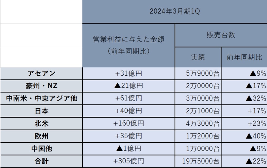 前年同期比で、販売台数は前年同期比+17%の2万1000台まで増加しており、営業利益に与える影響も+40億円と大きい。そのため、日本市場は回復基調にあると言える。