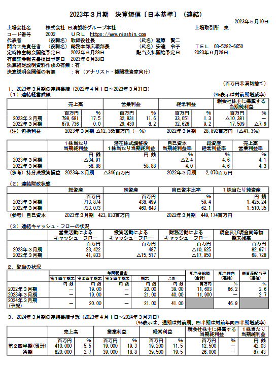 その結果、日清製粉グループ本社の株価は2023年7月24日、前日比+0.93%の上昇となりました。