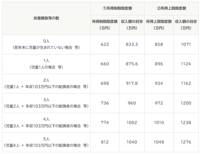 児童の年齢に応じて、児童を扶養する親の所得額が「①(所得制限限度額)未満」であれば、通常どおりの児童手当が支給されます。
