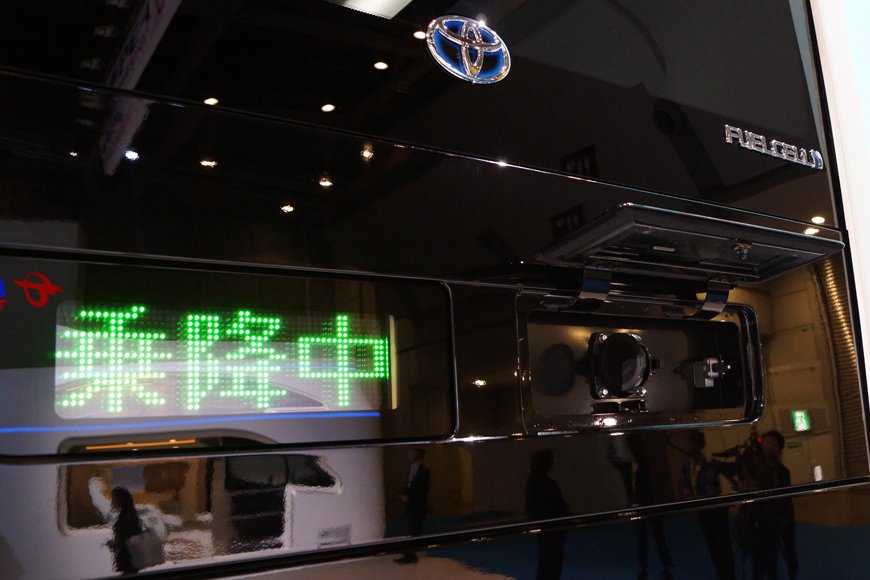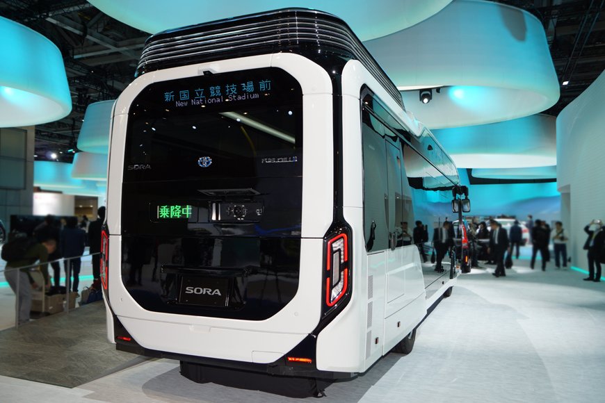 展示車両にはホイール部分にカバーが被せられているが、走行時は外されてタイヤが見えるようになる。「SORA」はコンセプトモデルだが、2018年には都内を中心に、東京オリンピックに向け累積で100台以上が導入される予定だ。