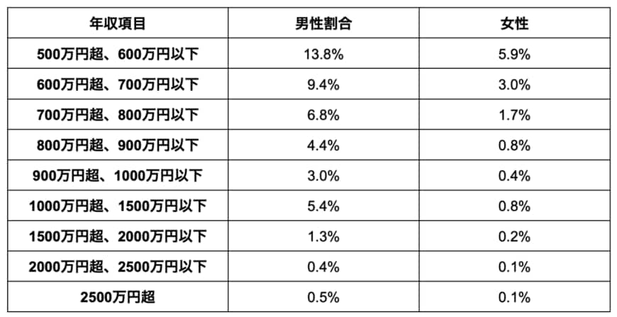「年収1000万円超」の割合が全体で4.9%、男性で7.6%、女性で1.2%であり、年収1000万円以上クラスの割合は他の年収と比較して非常に少数派となっています。