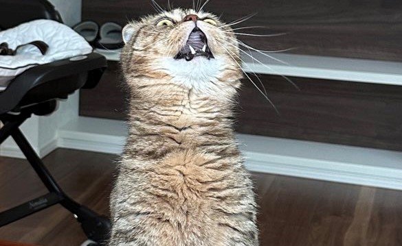 「エアコンをつけた時のたぬ吉」というコメントとともに投稿されたのは1枚の写真でした。そこに写っているのは、フローリングの上に2本足で起立する猫ちゃんの姿ですが……?