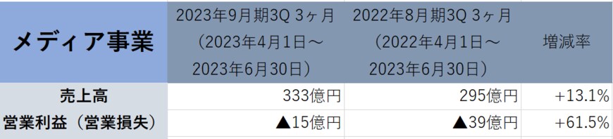 新しい未来のテレビ「ABEMA」関連売上高が順調に推移し、売上高は前年同期比+13.1%となり、営業損失も順調に縮小している。