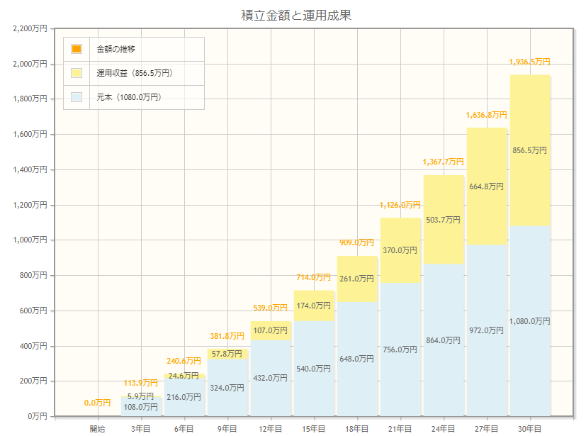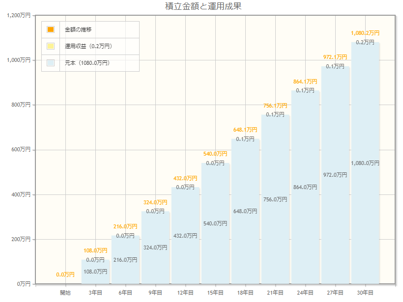 「預貯金」で毎月3万円ずつ30年間積み立てた場合