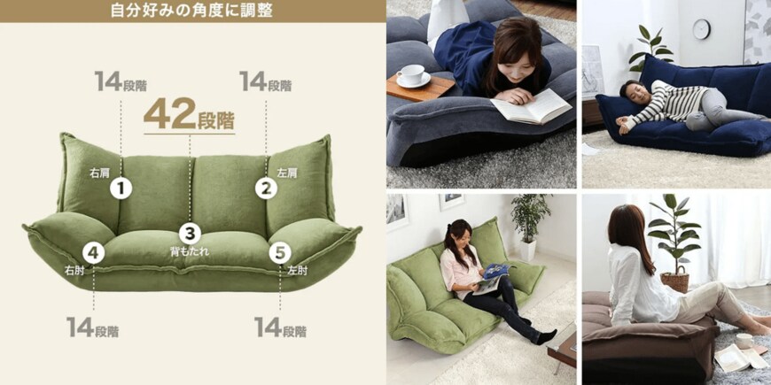 背もたれが調整できるソファは多くありますが、肉厚フロアソファは背もたれ・右肩部・左肩部・右肘部・左肘部の計5箇所が独立可動します。しかも背もたれは42段階、他は14段階と細かい調整が可能なので、自分が最高に快適と思える角度にカスタマイズすることができます。