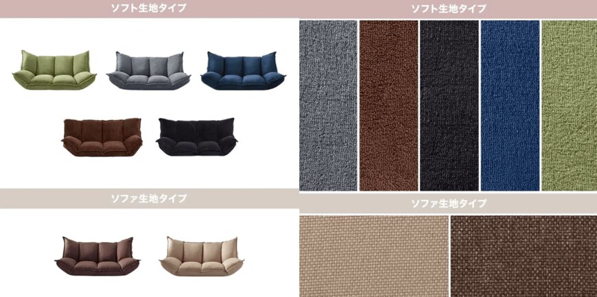 部屋の主役になるソファは色味も重要です。LOWYAの肉厚フロアソファは豊富なカラバリを用意しています。8月上旬には品切れになっていたカラーの再販が予定されており、ソフト生地タイプはグレー、ブラウン、ブラック、ネイビー、オリーブの4色、ソファ生地タイプはベージュ、ブラウンの2色から選択できます。