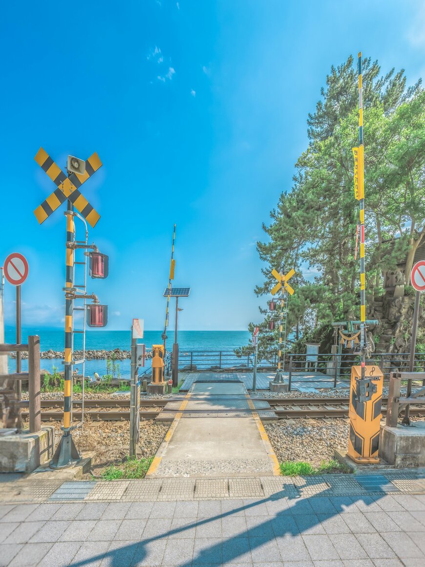エメラルドグリーンの海をバックにして、どこか幻想的な踏切の様子が際立っています。