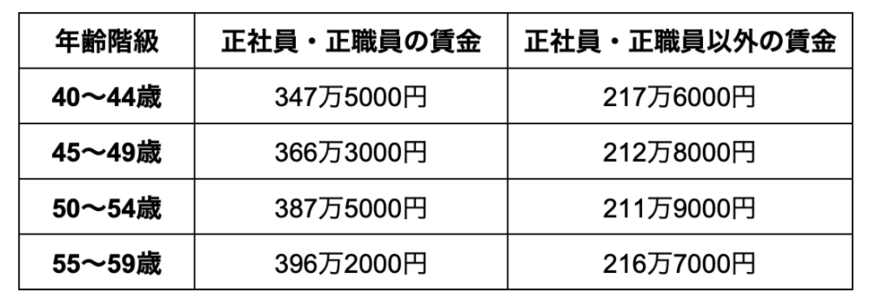 では、就職氷河期世代である「40歳代〜50歳代」の正規雇用と非正規雇用の賃金の平均はどのくらいなのでしょうか。