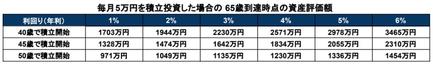 【年利別】40歳・45歳・50歳~65歳まで「月5万円の積立投資」シミュレーション