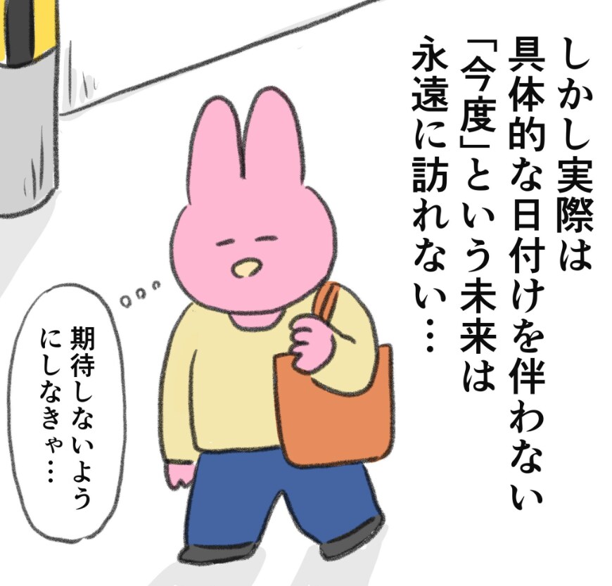 大人の社交辞令として「今度ご飯に行きましょう」はよく使われますが、このウサギのように繊細な人にとっては、心がズシッと暗くなる言葉なのかもしれませんね。