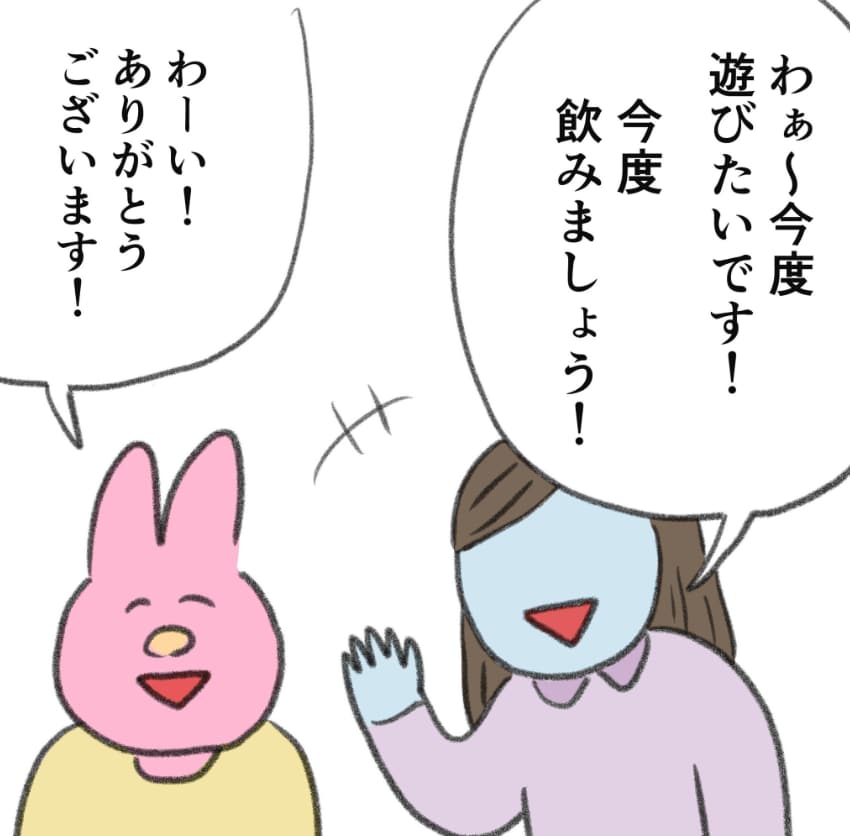 ウサギとまだ知り合って間もない女性がにこやかに話していました。女性は別れ際、「今度遊びましょう」「飲みましょう」と伝えて去って行きます。ですが、具体的な約束を取りつける様子はありませんでした…。