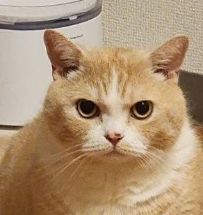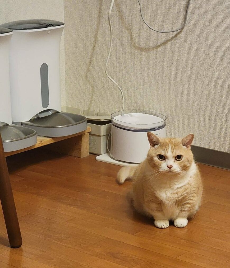 「にゃーにゃー鳴くからかまって欲しいのかな?と思って触ろうとしたらすたすた歩きだしてご飯の前でこの顔で訴えてきたw」
