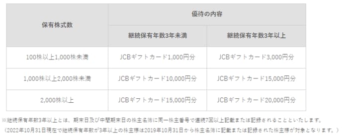 たとえば、100株以上1000株未満(継続保有年数3年未満)の人にはJCBカード1000円分が送られます。これを踏まえ、今回は優待のリターンを1000円と想定します。