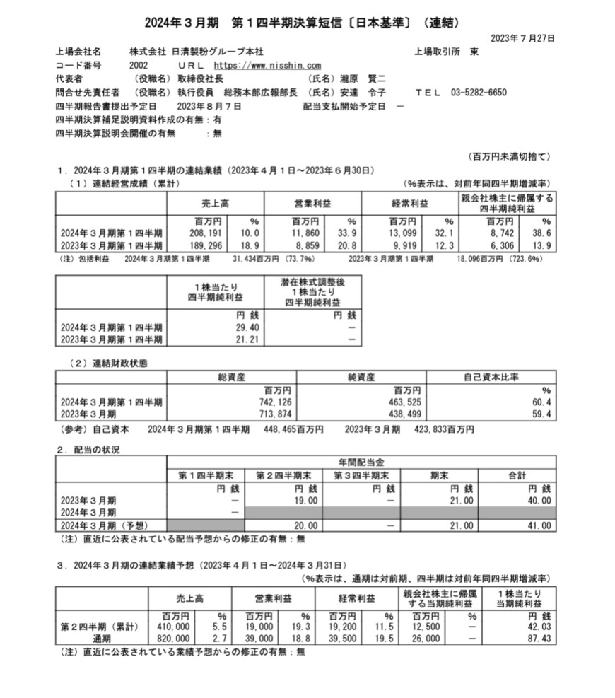 その結果、日清製粉グループ本社の株価は2023年7月28日、前日比+2.04%の上昇となりました。