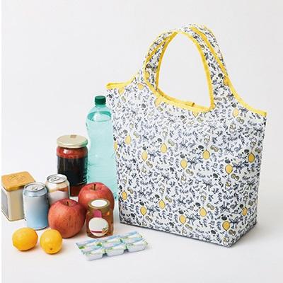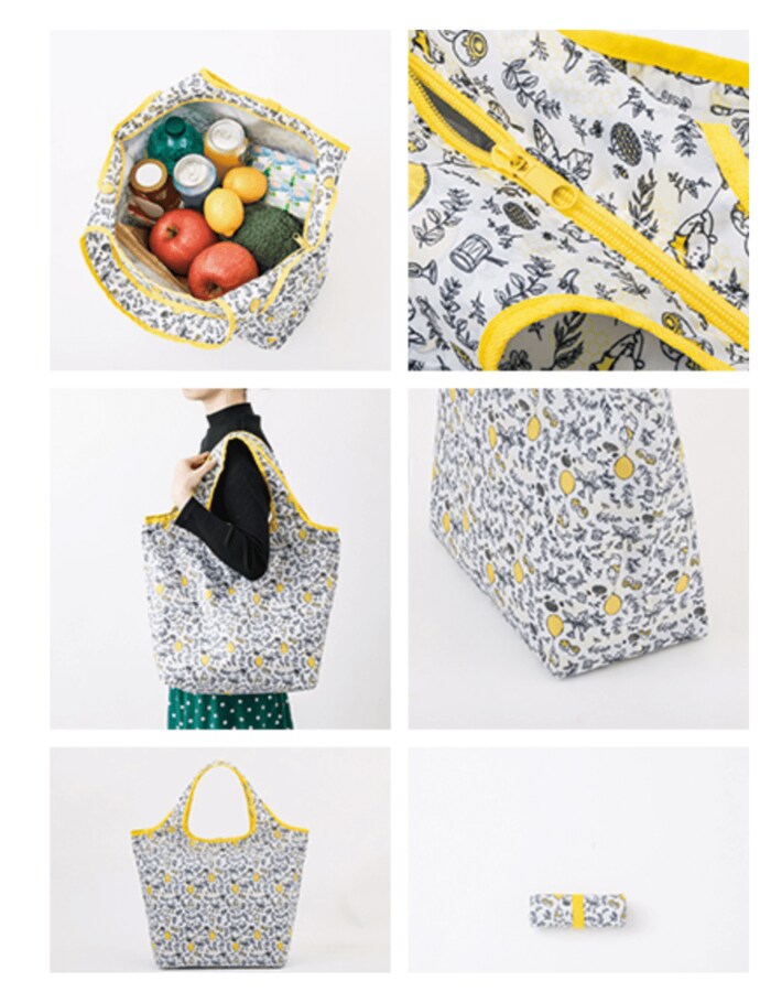 風船を持ったくまのプーさんとボタニカルな柄が可愛い保冷バッグは、 黄色いパイピングが目を引くデザインで、持つだけで気分が上がります。