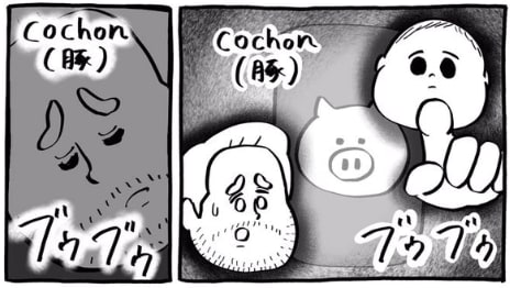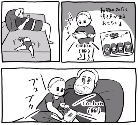 その後もボタンは連打され、部屋にはブタの鳴き声が響き渡りました…。ちょっとぽっちゃり体型のパパは、責められているようで居心地が悪そう。育児をしていると、子ども自身に悪気はなくとも、時に親のメンタルをグサッと削ることがありますよね。