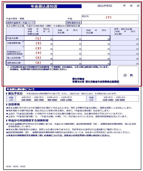 厚生年金等から天引きされる内容は、毎年6月に郵送される「年金振込通知書」で確認することができます。