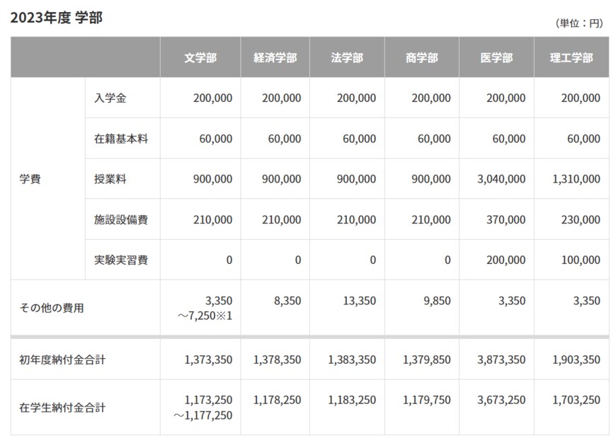 次に、私立大学の学費をチェックしていきましょう。慶應義塾大学の主な学部の初年度納付金は、以下の通りとなっています。