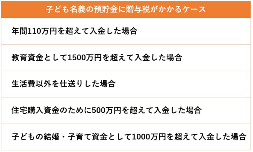 子ども名義の預貯金に贈与税がかかるケースは、以下の【図表】の通りです。