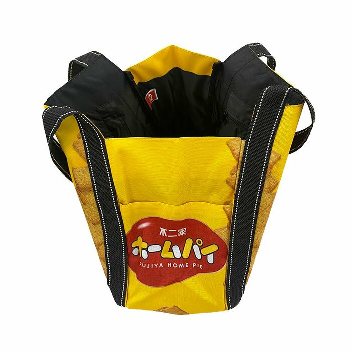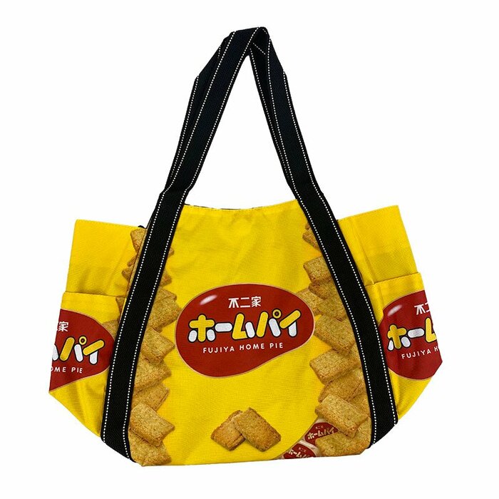 サクサクの食感がやみつきになる「ホームパイ」がプリントされたバルーントートバッグ。マチがたっぷりあり口も大きく開くので、まとめ買いしたいときやアウトドアにおすすめです。ファスナーつきの内ポケットがあり、鍵やスマートフォンなど大切なものが収納できます。