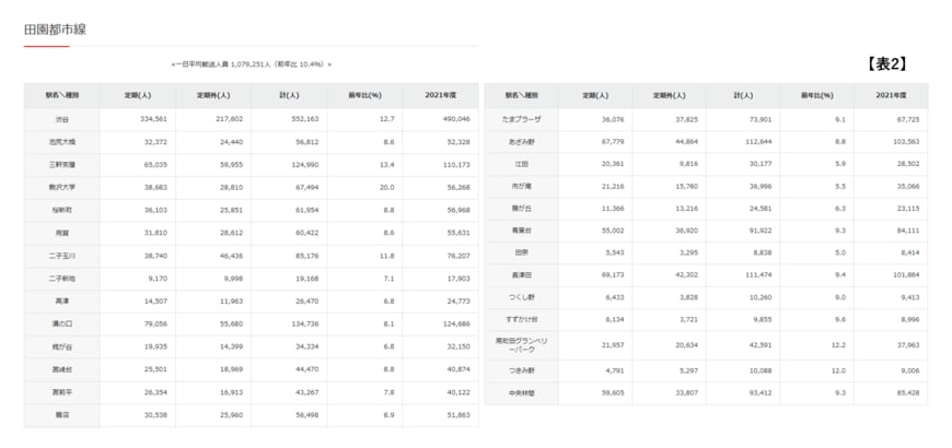東急電鉄株式会社のホームページに掲載されている情報をもとに駅別乗降客数の変化をみると、2022年度の駅別乗降客数は全駅で2021年度を上回りました。もっとも乗降客数が多い渋谷駅では49万46人から55万2163人に増え、前年比112.7%となっています。なおもっとも増加率が高かったのは、駒沢大学で5万6268人から6万7494人に増え、前年比120.0%でした。(全駅の乗降人数は【表2】を参照)。