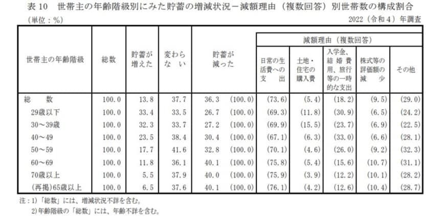 一方で2022年の調査で世帯主の年齢階級別に貯蓄の増減状況をみると、前年と比べて「貯蓄が減った」と回答した割合は全世代で36.3%となっており、60歳以上においては 4割を超えていました。