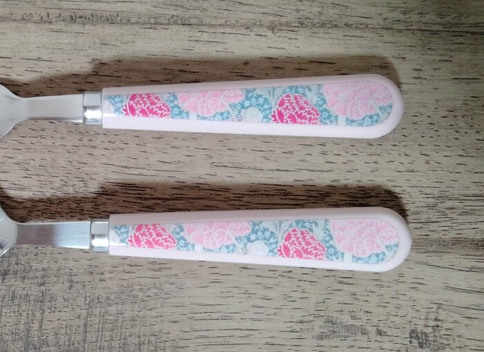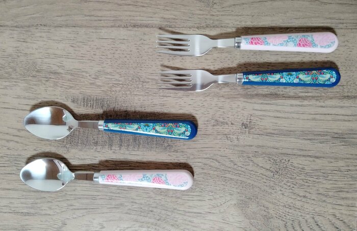 こちらがセリアで販売されている「モリスデザインのカトラリー」です。スプーンとフォークが販売されています。デザインは「いちご泥棒」と「クレイ」の2種類があります。