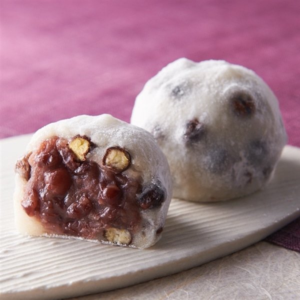 深い味わいの粒餡を甘さ控えめの生地で包み込んだ塩大福。生地には宮城県産みやこがね、餡には北海道産の大納言小豆を使っています。塩味と餡の甘さのバランスにこだわった商品です。