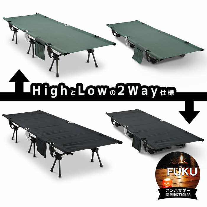 シーンに合わせてHighとLowいずれかの高さを選べる2WAY仕様のアルミコットです。取り外しが簡単なのにしっかり固定できるワンタッチハンドル式なので、初心者でも簡単に組み立てられます。