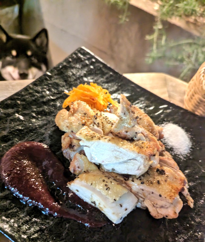 そこに写っているのは、とっても美味しそうなお料理……と思いきや、その奥をよく見ると、1匹のワンちゃんの姿がありました。