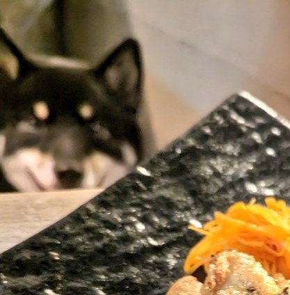 ぼんやりと写る表情ながら、目力の強さがうかがえます。なんだか「食べたいなぁ……」なんて心の声が聞こえてきそうです。その健気な姿とさりげない写り具合に、思わずクスッと来てしまいました。