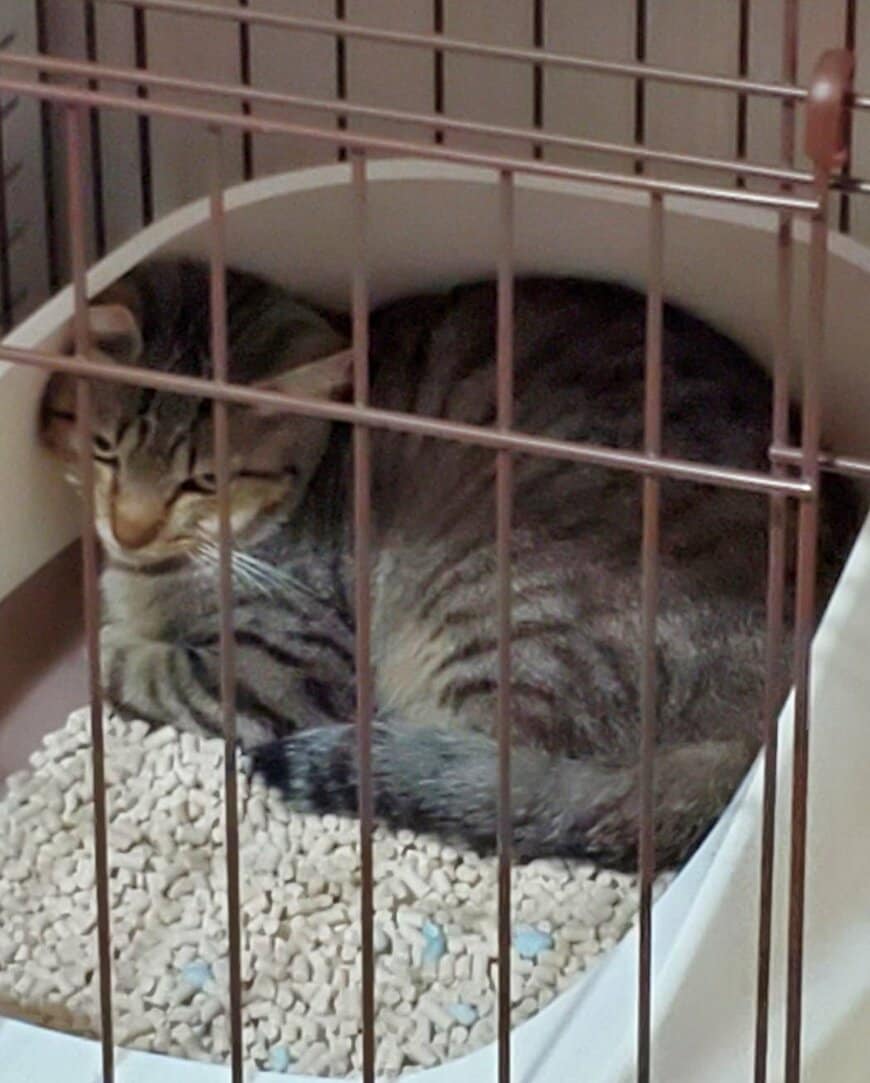 1枚目におさめられていたのは、トイレの奥で身体を丸めるメロンくんの姿です。当初はずっとトイレにいたというメロンくん。どこか険しげな雰囲気が伝わるような表情を浮かべているようです。