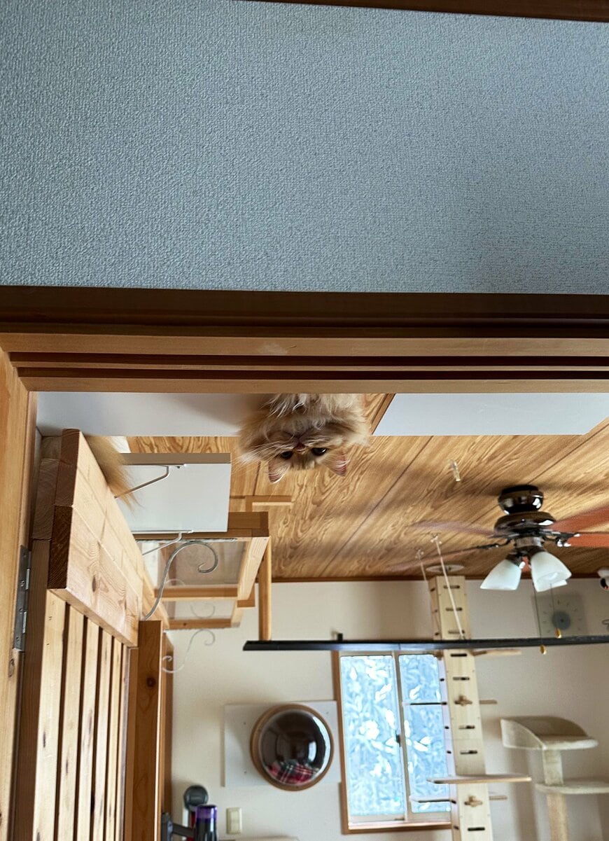 壁の向こう側にはキャットウォークがあるようで、エマちゃんはそこから顔をのぞかせていた様子。モフっと下を向いた被毛が視線を惹きます。ユーモラスなお見送り姿に思わず笑みがこぼれてしまいました。