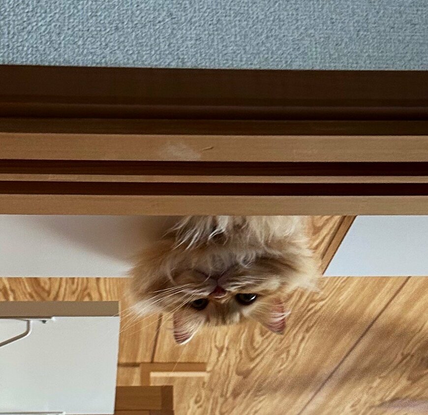 そこに写っているのは1匹の猫ちゃん。名前は「エマ」ちゃんといいます。エマちゃんは壁の反対側から、まるで「逆さま」になったかのような体勢で、ヒョッコリと顔を覗かせていました。