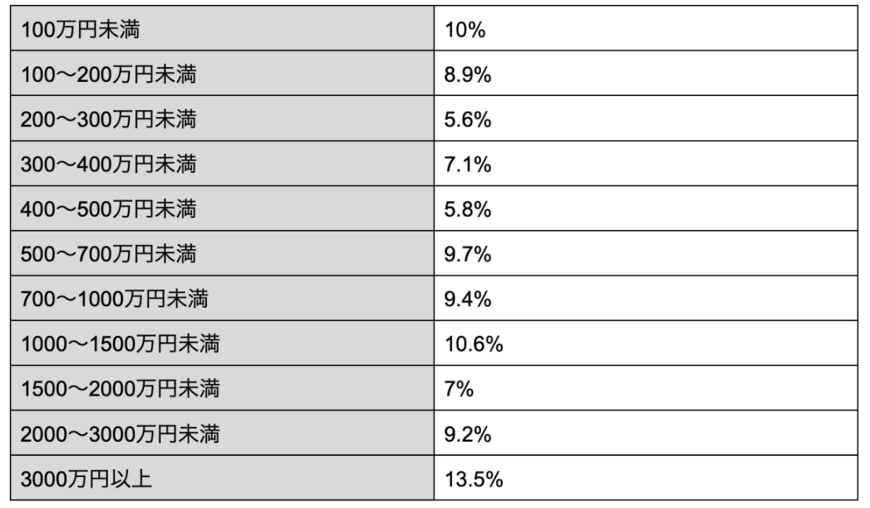 次いで1000〜1500万円未満の10.6%、500万円〜700万円未満の9.7%と続きます。