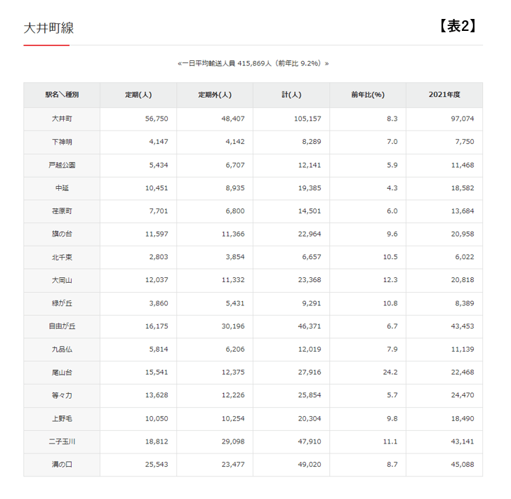 東急電鉄株式会社のホームページに掲載されている情報をもとに駅別乗降客数の変化をみると、2022年度の駅別乗降客数は全駅で2021年度を上回りました。もっとも乗降客数が多い大井町駅では9万7074人から10万5157人に増え、前年比108.3%となっています。なおもっとも増加率が高かったのは、尾山台で2万2468人から2万7916人に増え、前年比124.2%でした。(全駅の乗降人数は【表2】を参照)。