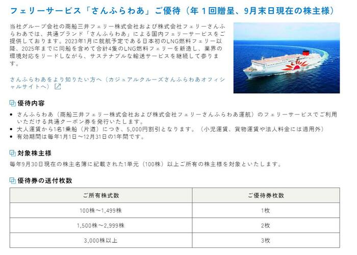 商船三井は決算期(2023年3月期)現在、100株以上保有する方に向けて「にっぽん丸」クルーズ優待を3月9月の年2回、フェリーサービス「さんふらわあ」優待を9月の年1回提供しています(配布枚数は株数により異なる)。