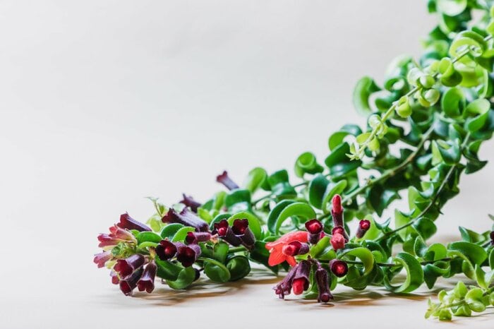 クルクルとカールした多肉質の葉がおしゃれなエスキナンサス・ツイスター。茎を伸ばしながら成長するツル性植物で、吊るして飾るハンギンググリーンとして楽しめます。